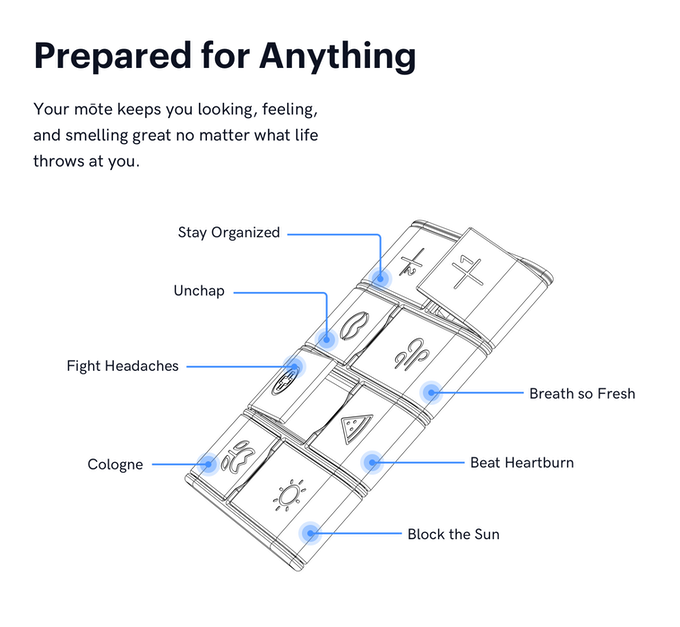 mote is a micro sized container used to carry your life care essentials neatly, organized and in style. Imagine carrying your medicine cabinet in your pocket/wallet/purse.